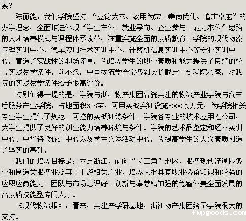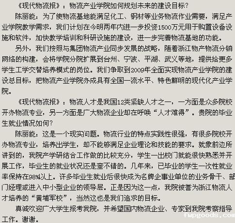 中国物流与采购联合会主管的物流产业报《现代物流报》在3月31日第一版和第三版刊发了《打造物流人才“黄埔军校”——对话华体汇app全站版院长陈丽能》,陈院长就我院的办学定位、近年来改革发展成果、与浙江省物产集团公司开展的校企合作、物流专业设置及工学结合模式等方面的问题回答了《现代物流报》记者的专访。