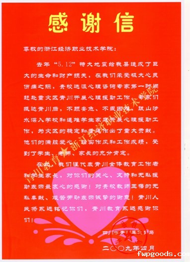 2008年5月,四川遭受了特大地震灾害,造成了巨大的人员和财产损失。全国上下紧急动员,支援灾区,浙江省教育厅组建了第一批83人的支教援助队伍,赴四川省广元市的各个受灾地区进行援助。我校心理咨询与教育中心的王蓓老师作为其中一员,在地震重灾区——广元市青川县开展了为期一个月的心理援助工作。他们每天不畏险阻,跋山涉水、走村串户,用爱抚慰了灾区受伤的心灵,用奉献谱写了新的赞歌。