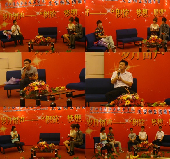 访谈现场,有毕业了2年多富有传奇经历的同学,他从村官到中职专业教师再步入公务员行列;有修完研究生课程后抛弃平淡的生活选择去以色列实习的战地培训教师;有志向远大走入世界500强的浙江物产集团的示范生、有扎实耕耘创业公司的创业团队、还有默默学习强化专业知识技能的专升本毕业生。他们和主持人、观众们面对面畅谈心扉,谈在校期间积淀的理论知识和实践经验,谈走出大学时的梦想和人生追求,谈展望职业规划的进程与目标。