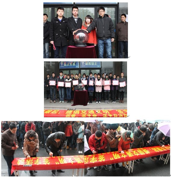 活动中,学校三大学生组织负责人共同按动“弘扬雷锋精神,提倡博学笃行”启动仪式暨深化学生社区团组织建设推进会启动球,启动仪式上还宣读了《团委关于深化学生社区团组织建设推进》和《团委关于表彰大艺展优秀志愿者和指导老师》文件,并进行了现场颁奖。学生自治自律委员会主席方俊带领学生干部们进行“学习雷锋好榜样,从自身做起,提倡交通文明”的宣誓。领导、老师、同学们进行了现场签名。