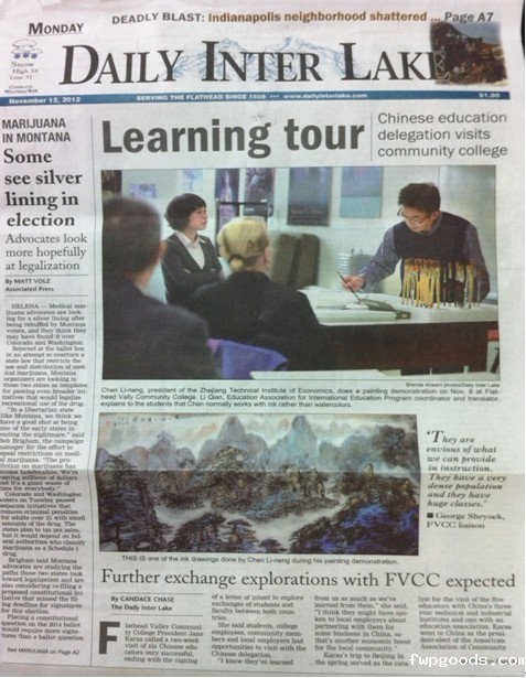 在美期间,陈丽能院长代表学校与美国蒙大拿州弗莱德海德谷社区学院(FVCC)签署了合作备忘录,双方今后将就师资培训、学生交流互访、学分互认、实习与研修、课程开发、科研合作等方面进行深入的合作交流。弗莱特海德谷社区学院是我国教育部认证的美国公立社区学院之一,建立于1967年,校区占地面积10000平方英里,开设专业有:会计技术(Accounting Technology),管理助理(Administrative Assistant),贸易(Building Trades),商业管理(Business Administration),厨房艺术(Culinary Arts),早期儿童教育(Early Childhood Education),电子技术(Electrical Technology)等。在该院交流期间,陈院长还给他们的师生上了一堂书画观摩课,当地报纸整版报道了该消息并刊发了陈院长的书画作品《黄山胜境》。