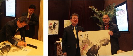 韩国高丽大学教授权大凤Dae Bong Kwon与朱红亮教授合作完成国画《清水出芙蓉》作品,权大凤教授并用毛笔题写“莲花”。