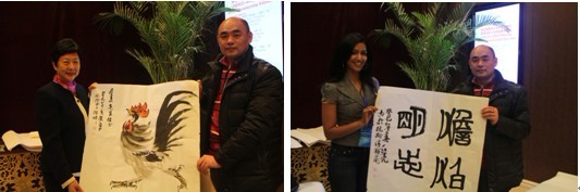 联合国教科文组织亚太地区办事处(曼谷)主任金光祚等专家、学者纷纷表示大学生的创新创业与其综合素养有密不可分的关系,学生的创新创业应立足国家和地区实际情况和文化背景,并对中国的传统文化艺术产生了浓厚的兴趣。金光祚主任即兴用软笔书写了中国的传统诗词《春晓》:“春眠不觉晓,处处闻啼鸟。夜来风雨声,花落知多少。”与会的国际职教界专家、学者观摩了中国画创作的过程展示,金光祚主任、韩国高丽大学教授权大凤等专家与朱红亮教授合作创作了多幅艺术作品。现场创作的艺术作品深受代表们的欢喜,书画作品赠送给印度国家社会企业家论坛主席Bhavna Toor、世界银行东亚及太平洋区域人力资源部主管居美、印度尼西亚的职教专家学者。