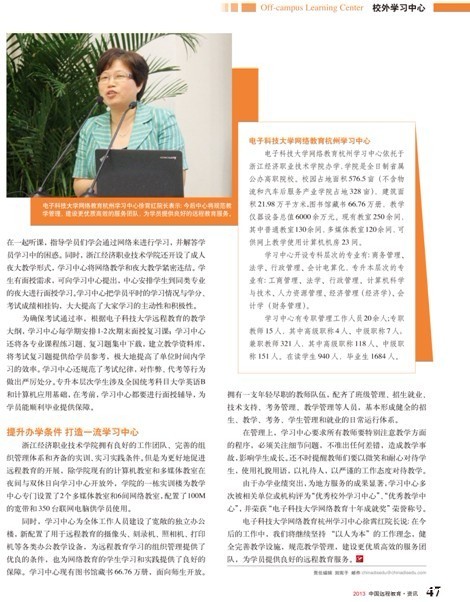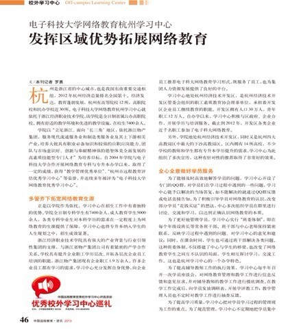 日前,《中国远程教育》(二0一三年三月 总第437期)刊发了题为《电子科技大学网络教育杭州学习中心:发挥区域优势,拓展网络教育》的报道,介绍了我校作为“2012年中国远程教育优秀校外学习中心”在远程教育行业的学习服务和管理体系。