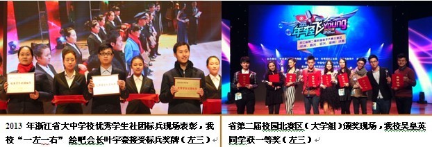 浙江省大中学生社团文化节自今年3月份动员部署至今近9个月,100余所高校的100多万大学生以及11个地市的中学生参与其中,我校团委积极准备,参与了演讲赛、辩论赛、微电影创作大赛、挑战杯、校园歌手大赛、征文活动等赛事,获得荣誉颇丰:财会金融学院潘奕同学荣获“激昂青春志共筑中国梦”浙江省大学生主题演讲比赛优胜奖,文化艺术学院吴皇英同学荣获“年轻飞young”2013年浙江省第二届校园北赛区(大学组)一等奖、下沙高教园区“歌唱青春”校园歌手大赛“校园十佳歌手”称号,2013年度在杭高校无偿献血知识竞赛二等奖,校青年志愿者协会会长、物流技术学院李梦梦同学获得浙江省优秀学生社团干部。