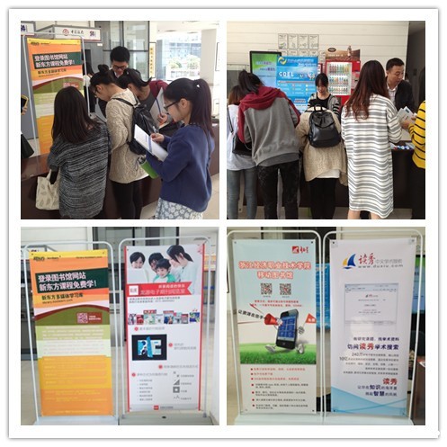 4月21日下午,图书信息中心在信息科学楼一楼大厅举办了数字资源集中宣传咨询活动。参加此次活动的数据资源有万方数据、EPS数据平台、超星移动图书馆、读秀学术搜索、正保多媒体教学、新东方英语、爱迪克森网上报告厅、龙源期刊、起点考试系统等。共有九家数字资源厂家受邀前来参加。