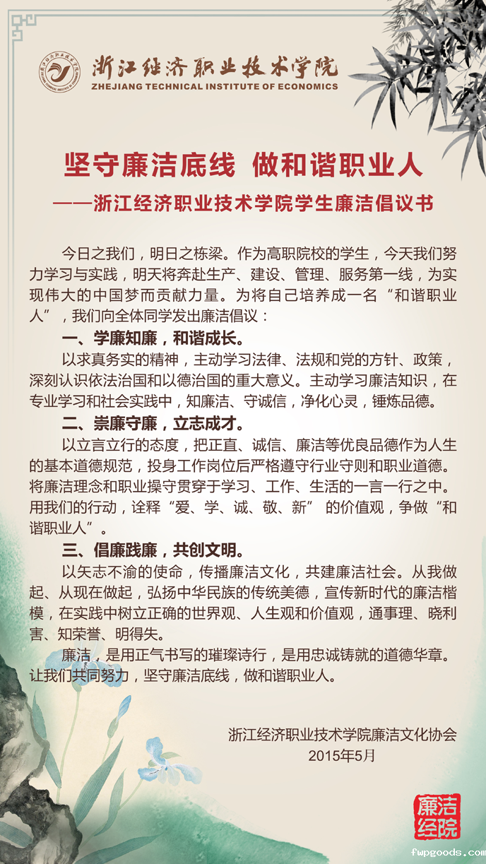 廉洁文化协会向全院同学发出了《坚守廉洁底线,做和谐职业人》的倡议。