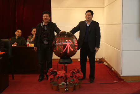 技能文化月组委会主任、副校长黄春麟与组委会副主任、教务处处长沈建国共同按下启动球