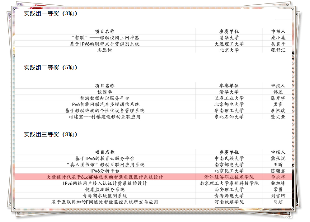 12月18日至20日,第一届下一代互联网技术创新大赛全国总决赛在清华大学举行,由我校王义勇、俞华锋、蔡暐、董一方老师指导,李永辉、韦志刚等同学参赛的作品《大数据时代基于6LoWPAN技术的智慧社区医疗系统设计》荣获实践组三等奖。我校是唯一一所在决赛中获奖的高职院校,其余大多为211、985高校。
