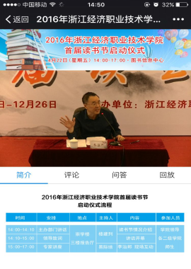 图书信息中心副主任主持并致辞,他指出,我校图书馆从前身浙江省物资学校1978年成立图书资料室到现在的图书信息中心,经过近40年的发展,目前已经具有纸质藏书规模80万余册,中外文报刊900余种,正式引进的数据库15个,自建的资源库囊括了校本的优质视音频、电子课件、教学设计文档等。此次读书节活动将从纸质图书和数字资源两方面着手,不仅有针对纸质图书的 “好书共分享,读书交流”、“真人图书馆”等活动,也有以数字资源为基础的移动图书馆线上体验、“畅游知识无极限”等活动。希望通过读书节系列活动的开展能让校园更有书香气、教师更有书卷气、学生更有书生气。