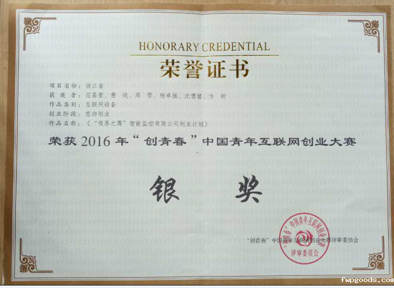 9月22日-24日, 2016年“互联青春 创梦未来”中国青年互联网创业大赛决赛在杭州梦想小镇举行,我校《“视界之鹰”智能监控有限公司创业计划》团队在大赛全国1.2万个项目中脱颖而出,斩获银奖,成为全省高职院校中唯一获得金银奖的团队。浙江省人民政府副省长高兴夫,共青团中央书记处书记汪鸿雁,浙江团省委副书记、党组副书记朱林森等出席表彰并颁奖。