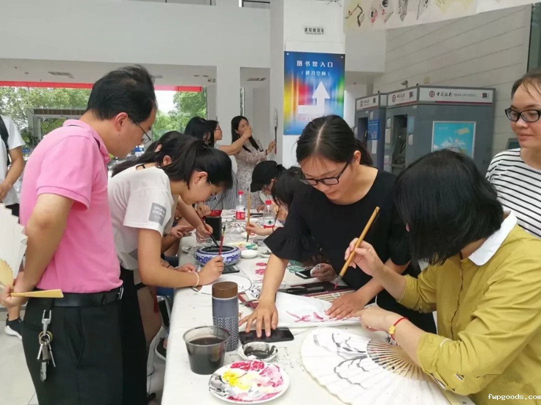 师生们在兰竹轩书画社团的同学们指导下绘制扇面