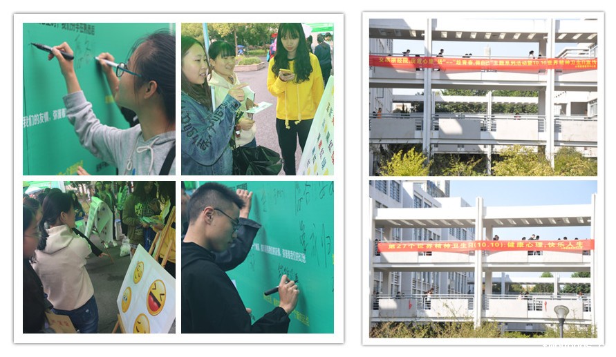 2018年10月10日,是第27个世界精神卫生日,为提升大学生精神卫生和心理健康意识,学校心理健康教育中心在学生社区明月苑广场开展了“交织经院情,绽放心里话”趁青春做自己主题系列活动暨世界精神卫生日宣传活动。