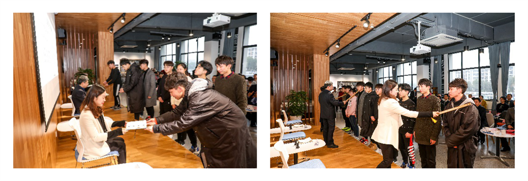 梦想创业学院院长助理温雷雷担任了拜师仪式的“司仪”,通过双向选择结成师徒关系的师生分批上台。拜师仪式由两部分组成。一是徒弟向导师呈上拜师帖,并向导师行礼:一鞠躬,感谢导师辛勤培养;再鞠躬,认真学习努力奋斗;三鞠躬,不负师恩早出成果。二是导师持戒尺训诫徒弟:一敲头,头脑清醒,敬业于群;二敲肩,永担重担,敢于创新;三敲身,做事有度,循序渐进。这简单的仪式既表达了徒弟对导师的拳拳之心,也体现了导师对徒弟的谆谆教诲。拜师仪式之后,全体徒弟起立,高声诵读《弟子规》。