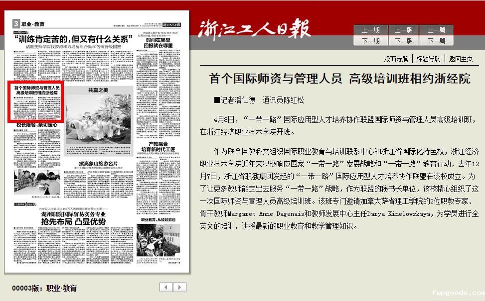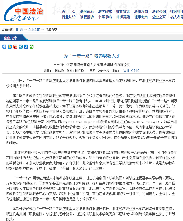 4月8日上午,“一带一路”国际应用型人才培养协作联盟国际师资与管理人员高级培训班,在我校培训大楼开班。该班专门邀请加拿大萨省理工学院的2位职教专家(骨干教师Margaret Anne Dagenais和教师发展中心主任Darya Kinelovskaya),为学员进行全英文的培训,讲授最新的职业教育和教学管理知识。中国法治网、浙江工人日报等进行了报道。敬请关注。