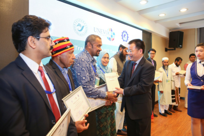 以“技能促进可持续发展”为主题的2019“一带一路”绿色技能国际培训,于5月10日在我校国际文化交流中心举行结业仪式。党委书记骆光林将英文版《习近平谈“一带一路”》作为结业礼物赠给每位外国学员,学员们也依次回赠礼物;副校长黄春麟总结陈辞,并颁发结业证书;浙经院学子还为外国学员作了汉服、茶道、礼仪操等中国传统文化展示。