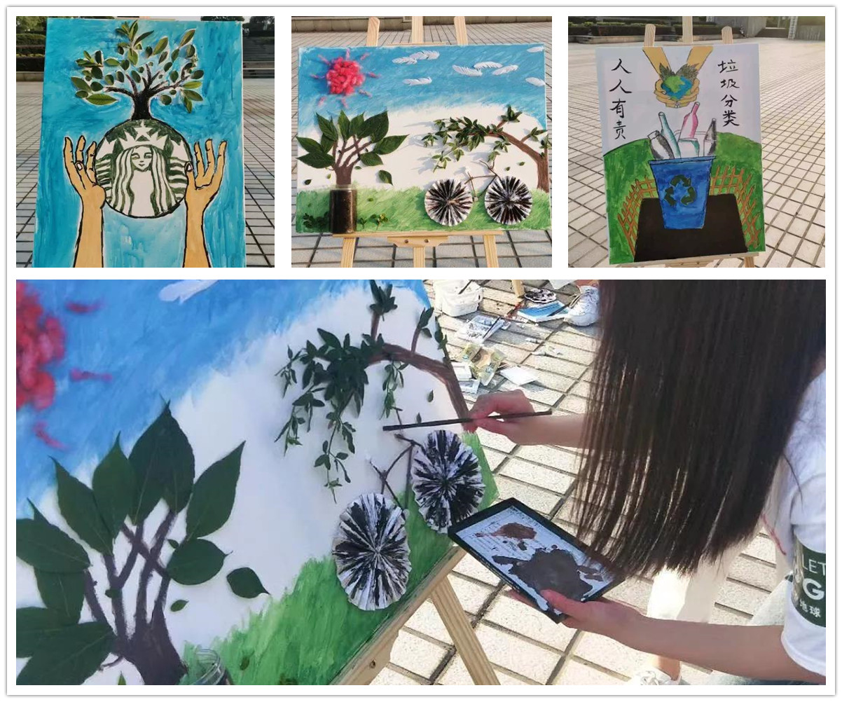 17级营销专业李佩珊同学主持活动并且发出环保倡议。现场同学们头顶烈日作画,用咖啡渣辅以环保颜料,画出日常生活中切实可行的环保行为。本次活动结合市场营销策划课程中的公关策划,将企业的公益项目引入校园,实现场景化和项目化的教学方式,让学生真实地参与企业活动。同时,通过参与星巴克的公益环保活动,将企业责任与大学生应肩负的社会责任进行链接,培养新时代大学生、新时代营销人员的社会责任意识,进行课程思政教学方式的新探索。