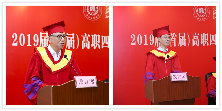 陈思琦同学代表本科毕业生发言。她说我们都是幸运儿,乘上了首届高职四年制本科招生的列车,成为浙江工商大学和华体汇app全站版的学生。回顾了大学期间两所学校给予同学们的关心关爱。她希望大家拼搏努力,不辜负母校的期望。她祝愿两校的明天更加灿烂辉煌。