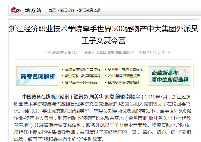 今年7月,我校物流与供应链管理学院党总支选派的9名党员和入党积极分子在校团委书记、组织员、学生党支部书记周美华、辅导员刘意两位老师的带领下,牵手世界500强企业-物产中大集团,赴集团旗下的物产长乐教育基地(全省首批“浙江省关心下一代教育基地”)开展暑期社会实践活动,服务外派员工子女夏令营支教。中国教育在线、杭+新闻APP客户端进行了报道。敬请关注。