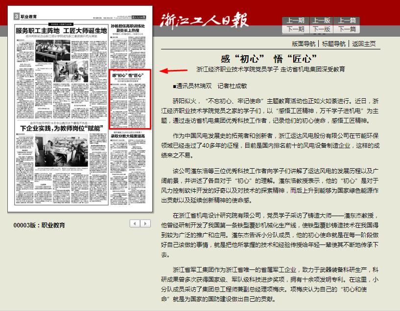 “不忘初心,牢记使命”主题教育活动正在浙江大地如火如荼地进行。为配合省机电集团扎实推进主题教育,我校党员之家的党员学子以“感悟工匠精神,万千学子进机电”为主题,通过采访省机电集团首批优秀科技工作者,记录其初心使命,感悟工匠精神。中国教育在线、浙江工人日报等进行了报道。敬请关注。