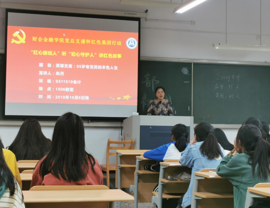 为进一步推进“不忘初心、牢记使命”主题教育,财会金融学院党总支部署开展了播种红色基因行动,即“红心接班人”(学生)听“初心守护人”(党员)讲红色故事。总支要求全体党员教师每人选取具有典型意义的革命和建设年代的红色故事,利用学生晚自习时间,通过上课形式进班讲授。