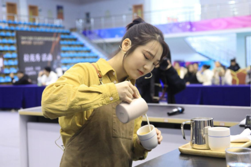 ▲图为“咖啡技能”竞赛一等奖选手比赛中