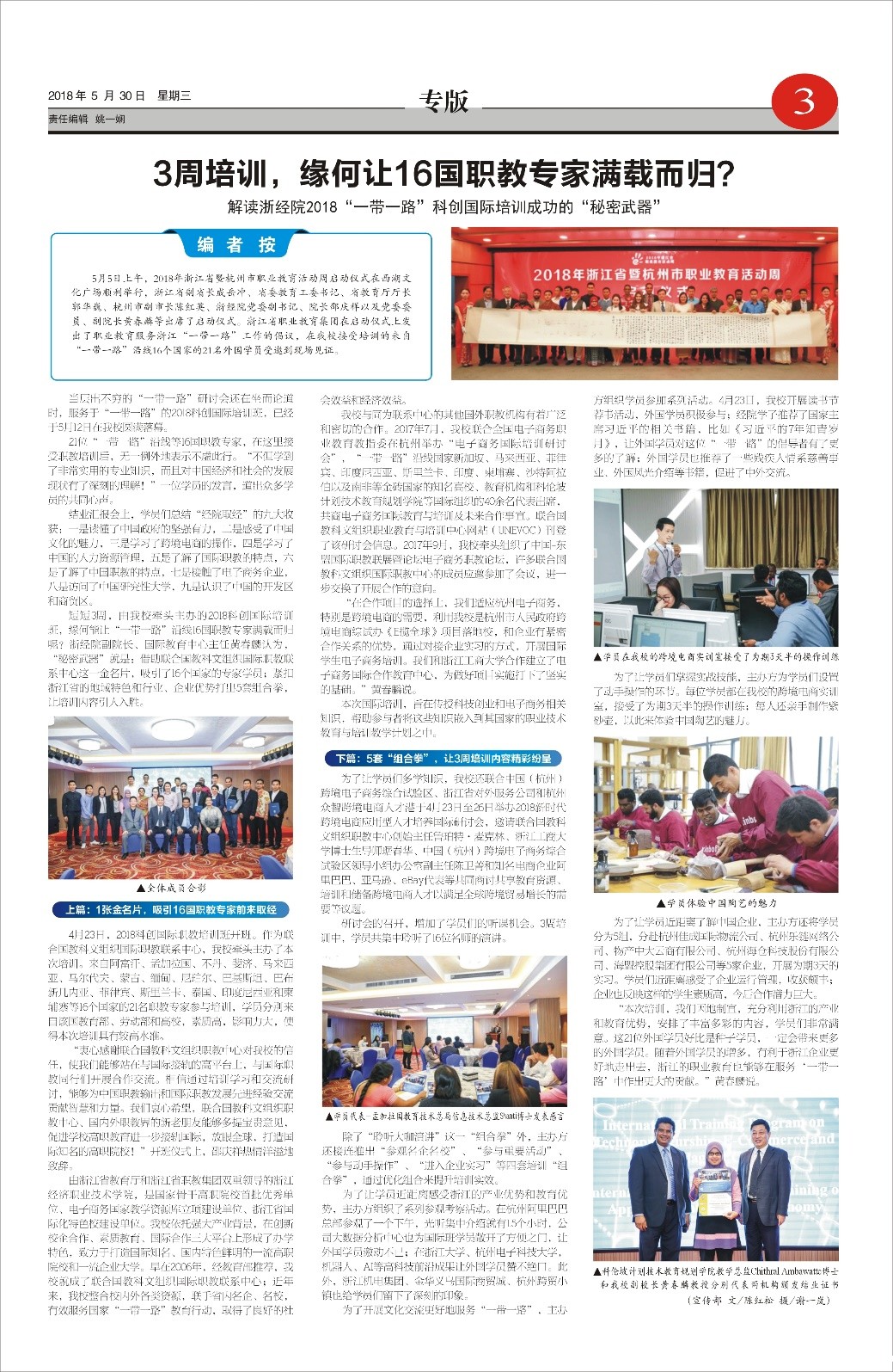 此外,姚一娴老师编辑的“一带一路”专版(2018年5月30日第3版),获得好版面三等奖。该版刊登了《3周培训,缘何让16国职教专家满载而归?——解读浙经院2018“一带一路”科创国际培训成功的“秘密武器》这则长篇通讯,讲的是作为联合国教科文组织国际职教联系中心,我校牵头主办2018“一带一路”科创国际培训班,得到16个国家21名职教专家的高度评价。该版由陈红松老师写稿,谢一岚老师配图。