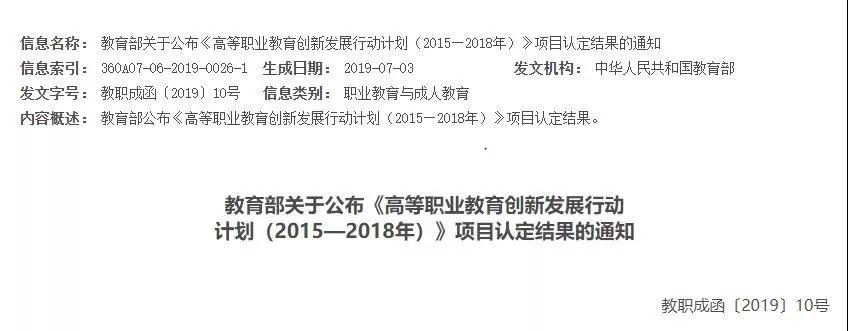 学校成功入选国家优质专科高等职业院校,6个骨干专业、2个生产性实训基地、1个“双师型”教师培养培训基地和1个协同创新中心入选高等职业教育创新发展行动计划认定项目。