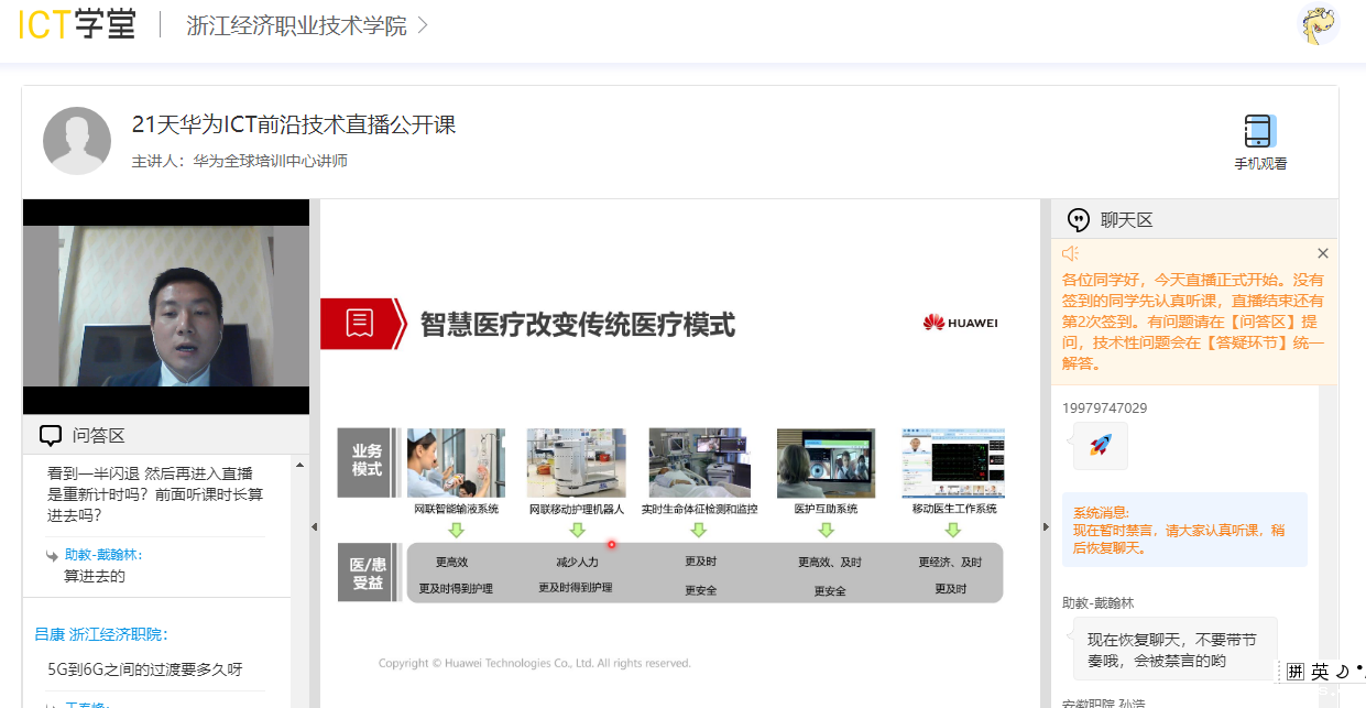 自新型冠状病毒感染的肺炎疫情发生以来,数字信息技术学院积极响应学校党委和学校疫情防控工作领导小组的统一部署,落实学校“学生停课不停学,教师停课不停教” 、主动采用“互联网+教学”形式等要求,充分发挥学院的专业特色,联合浙江华为通信技术有限公司开展ICT前沿技术直播课-21计划在线学习。