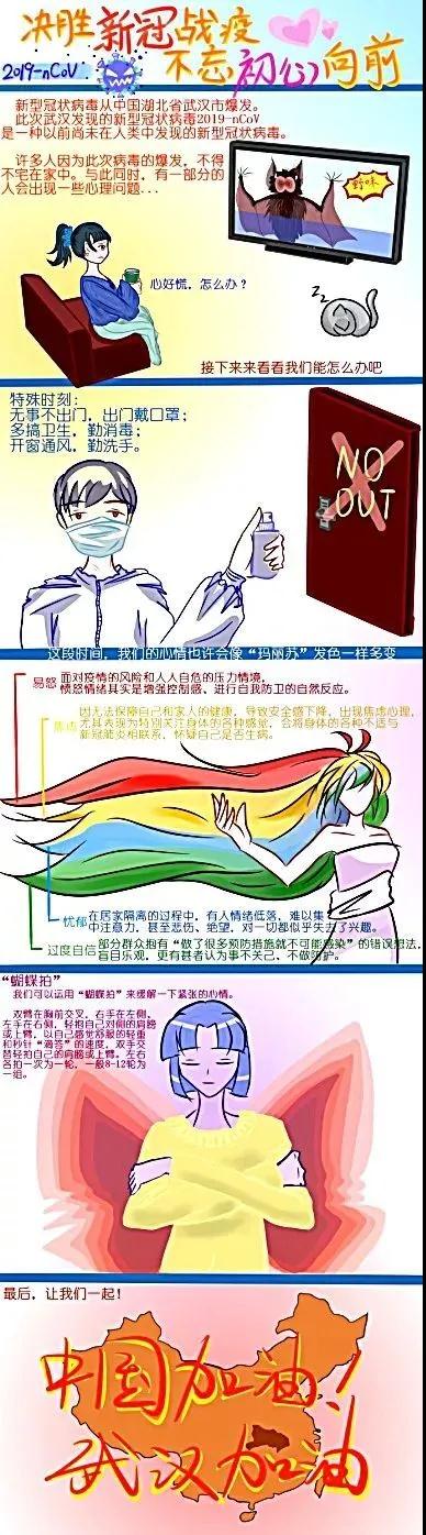 战疫期间,每个人都应该做好身心防护,共抗疫情。长时间待在家中,我们可能会觉得无聊,甚至出现心理不适,建议大家早睡早起,养成良好的生活习惯,保持心态稳定;也可以制定一些学习小计划,例如阅读、听舒缓音乐等来缓解焦虑情绪;还可以通过一些心理技术,比如放松训练、蝴蝶抱等来安放我们的身心。希望疫情快点好起来,中国加油!