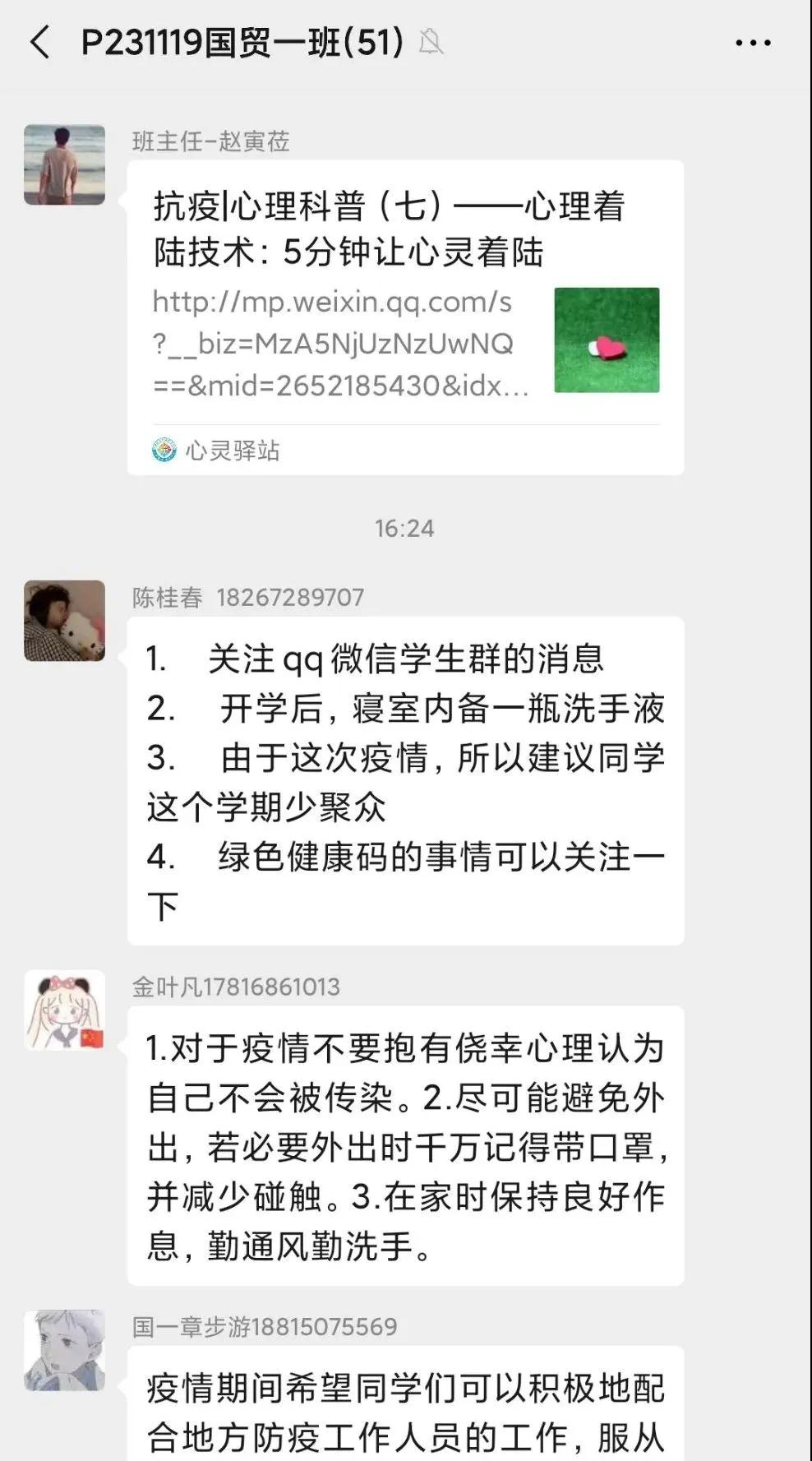 倡导同学主动学习和宣传疫情防控知识,做好个人防护,保持良好心态,关心关爱他人,在互动中解答同学在疫情防控中的疑惑,降低不安和紧张感。对部分同学进行一对一的沟通,送去来自老师温暖的关爱。