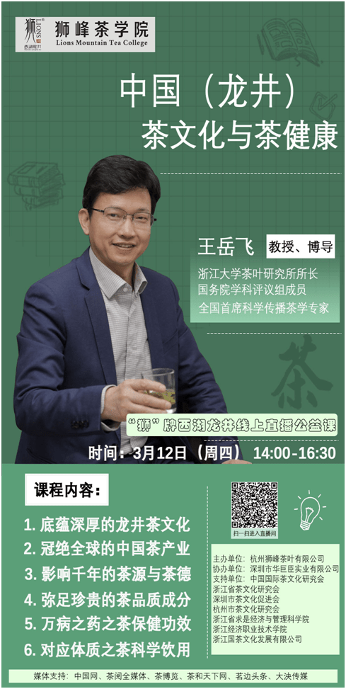 西湖龙井直播公益课由杭州狮峰茶叶有限公司主办,狮峰茶学院承办,深圳市华巨臣实业有限公司协办,中国国际茶文化研究会、浙江省茶文化研究会、深圳市茶文化促进会、杭州市茶文化研究会、浙江省求是经济与管理科学院、华体汇app全站版、浙江国茶文化发展有限公司等单位支持。2020年3月11日至13日,“狮”牌西湖龙井茶线上直播公益课开讲。浙江在线、浙江新闻等媒体进行了报道。敬请关注。