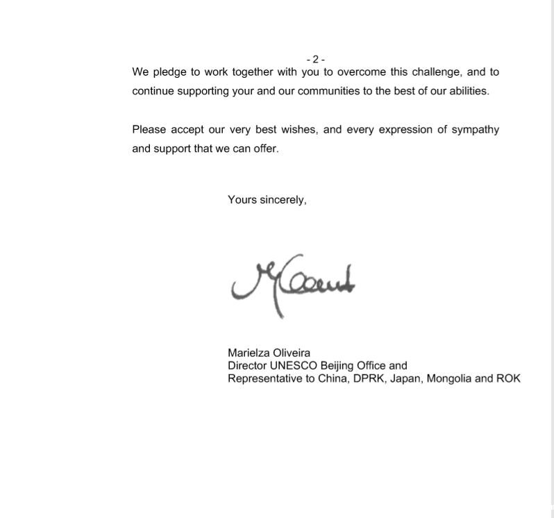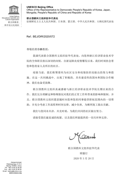 3月20日,联合国教科文组织驻华代表处主任欧敏行(Marielza Oliveira)给我校发来慰问信,表达了对学校全体员工的支持和问候。她表示联合国教科文组织驻华代表处真诚感谢与我校长期以来的合作,并将与我们同舟共济、共克时艰。