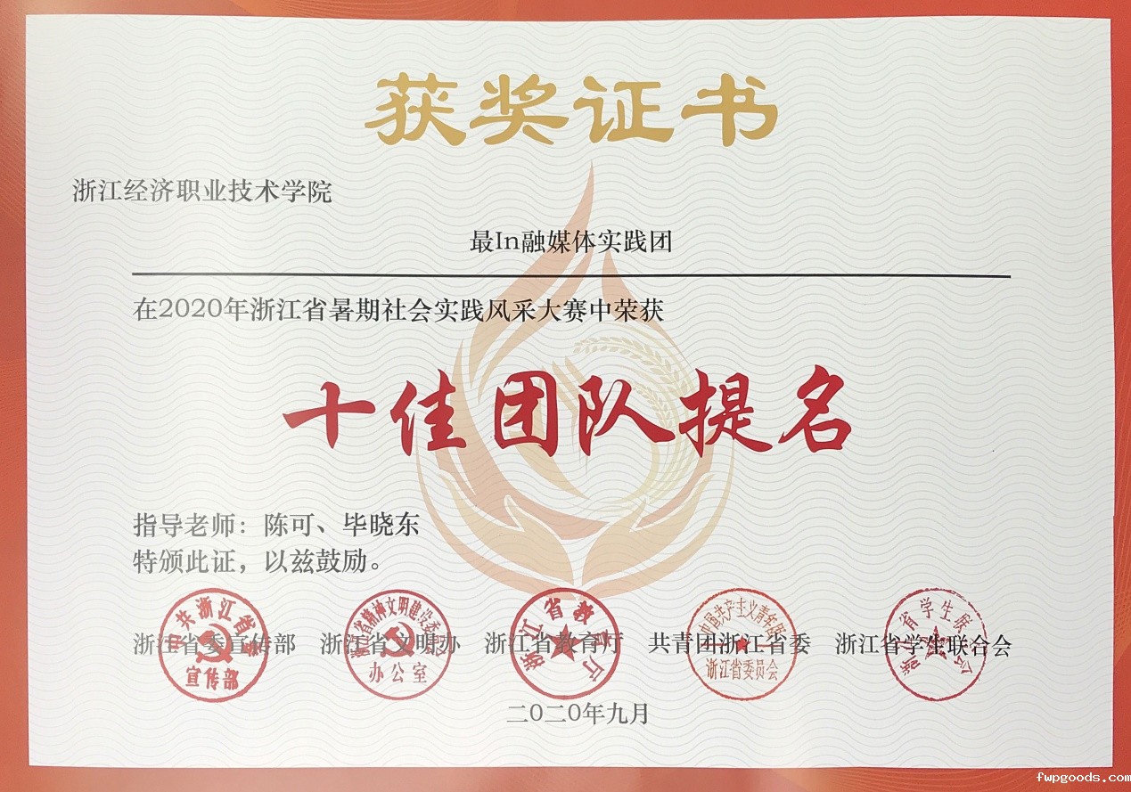 9月14日,浙江省2020年暑期社会实践风采大赛决赛在浙江工商大学落下帷幕。我校数字信息技术学院的“最In融媒体实践团”从全省565个团队中脱颖而出,进入全省前20强,荣获大赛“十佳团队提名奖”。