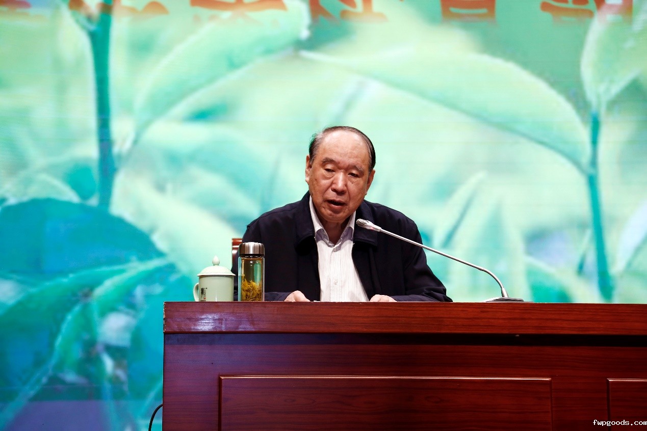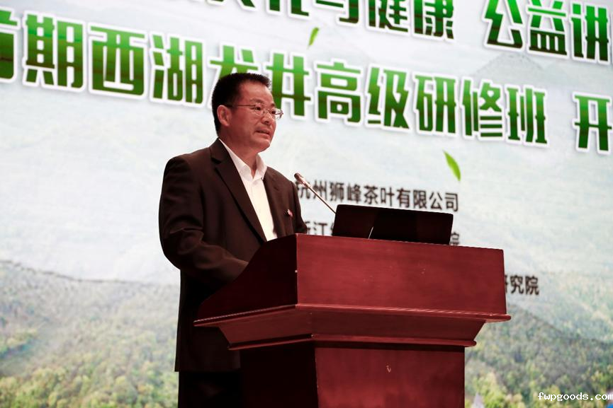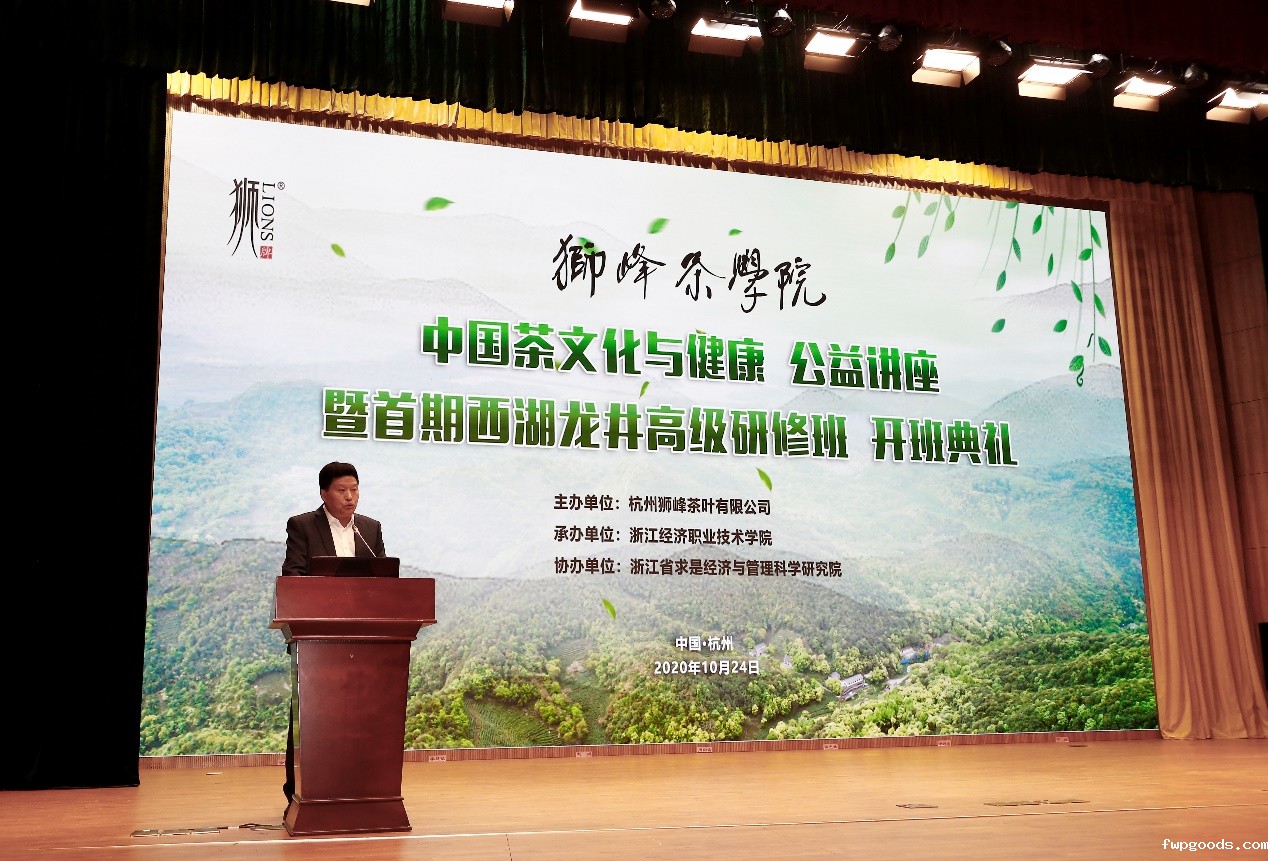 启动仪式结束后,中国国际茶文化研究会会长、浙江省政协原主席周国富,亲自为狮峰茶学院首期西湖龙井高级研修班学员作《中国茶文化》讲座。他在讲座中指出,作为中国绿茶一号品牌,“西湖龙井”具有多重文化属性:一是清代的皇帝文化,二是当代的领袖文化,三是百姓文化,四是西湖申遗并获得世界非物质文化遗产,五是前些年国家农业部在定位龙井茶品牌中,有西湖龙井、钱塘龙井、越州龙井三个区域品牌,其中西湖龙井排名前列等等。如此厚重的西湖龙井绿茶品牌文化享誉中国美誉世界,是中国茶界的金字招牌,是中国茶文化的宝贵财富,应当倍加珍惜,发扬光大。为此,他提出了打造龙井茶品牌的金字塔构想,作为高端茶,在西湖龙井、钱塘龙井、越州龙井三大龙井茶板块中,西湖龙井应是塔顶,其它是塔身;在做精做优西湖龙井品牌高端茶的前提下,精彩龙井茶的“六茶共舞”,要充分发挥西湖龙井茶文化和龙井茶园地处西湖旅游景区的综合优势,融合儒释道文化、西湖非遗文化、民俗文化和旅游休闲文化,不断推进西湖龙井茶和西湖龙井茶文化发扬光大,美誉人间,走向世界;丰富茶饮文化,满足人们日益增长的美好生活需要,进一步推进茶为国饮、科学饮茶,进一步发挥茶和茶文化的重大作用。