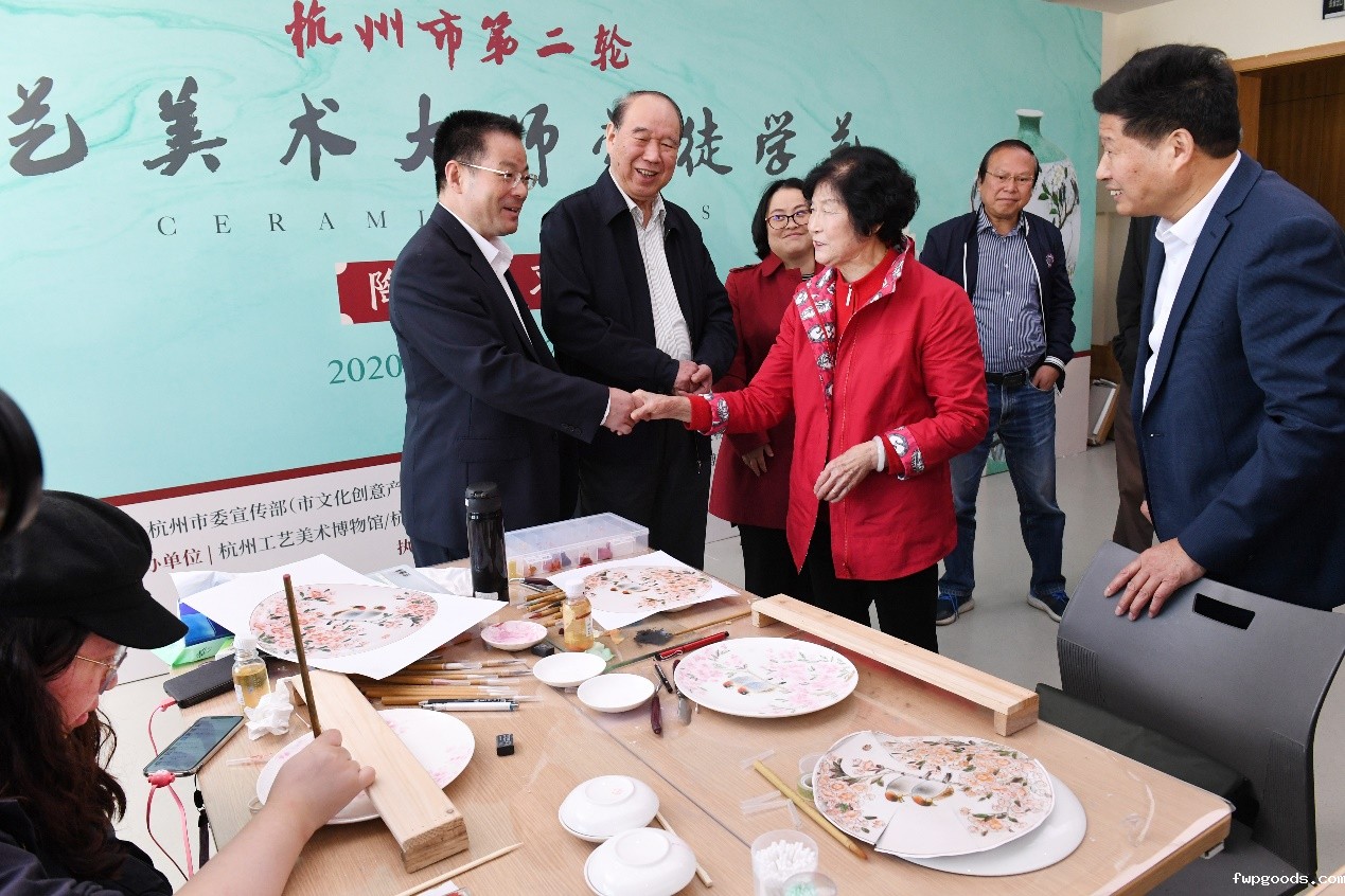 本次活动期间,骆光林向周国富汇报了浙经院的办学情况,得到了周国富的充分肯定。另外,恰逢杭州市第二轮工艺美术大师带徒学艺陶瓷传习班在我校举行。周国富在骆光林、余伟永的陪同下,前去探望中国工艺美术大师嵇锡贵和培训班学员。在对学校办学能力点赞的同时,他勉励两个班的学员要在大师引领下,通过自身不懈努力,不断提升专业水平。