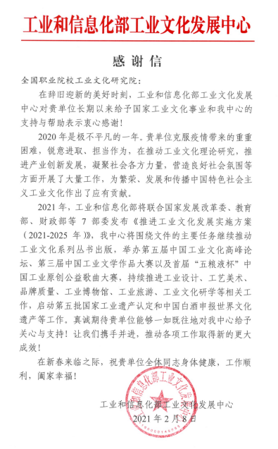 为感谢学校全国职业院校工业文化研究院的突出工作,工业和信息化部工业文化发展中心特发来感谢信,全文如下: