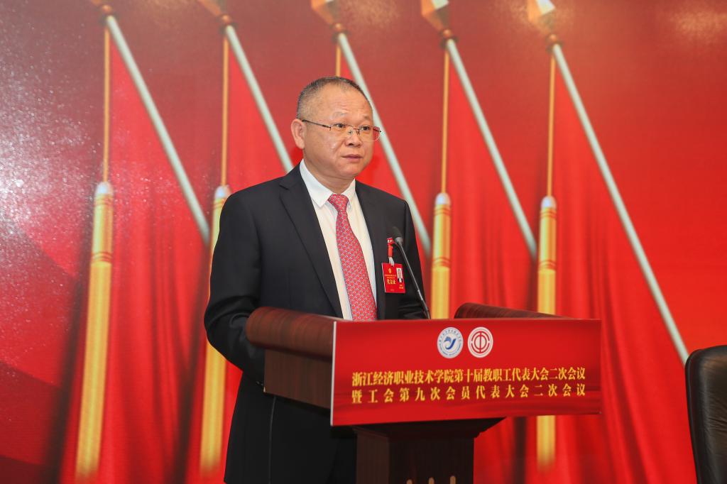 党委副书记、校工会主席吕红刚作了题为《凝心聚力创一流 建功立业谱新篇》的工会工作报告。报告回顾了一年来学校工会所取得的五方面成绩:常抓不懈“强学习”,持续深化理论武装;规范运行“强制度”,提升工会治理效能;职工活动“强文化”,提升花样品牌内涵;维权保障“强服务”,办好普惠福利事项;争先创优“强典型”,弘扬劳模工匠精神。同时,报告明确了2021年的四条工作思路:坚持政治立魂,深化理论学习,提升思想引领实效;坚持系统治理,落实普惠维权,共促学校和谐发展;坚持统筹资源,迎接建党百年,办好花样文化活动;坚持数智赋能,建好网上工会,智慧工会提质增效。