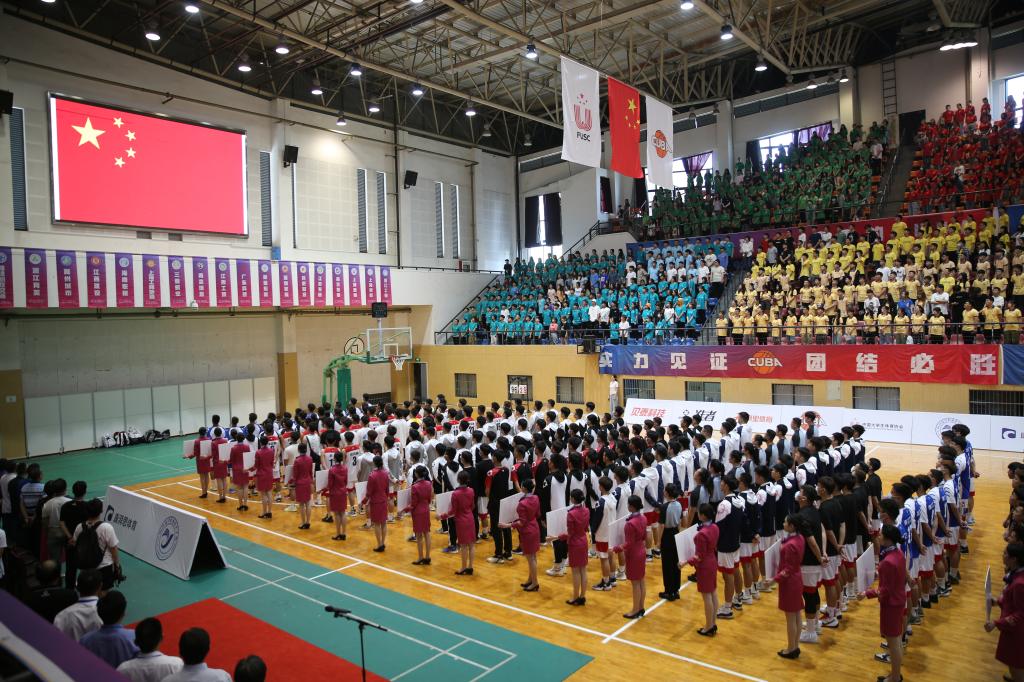 在我校操舞队、武术队、表演艺术专业同学带来的精彩节目表演之后,16支男篮和8支女篮参赛队伍与裁判员代表依次入场,全体起立奏唱国歌。