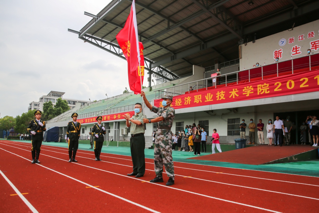 姜宇国为新生团团长叶锋授军训团团旗。