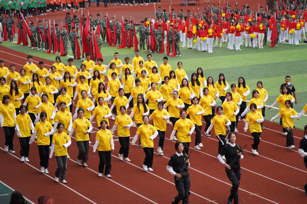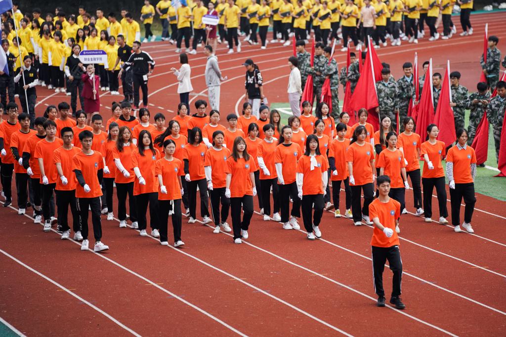 一年一度的体育运动会,既是对学校体育工作、师生体育素质和精神风貌的一次检阅,更是师生欢聚、增进交流、公平竞争、团结拼搏的一个平台。伴随着雄壮的《运动员进行曲》,国旗护卫队、校旗队、鲜花队、彩旗队和各二级学院方队依次入场。