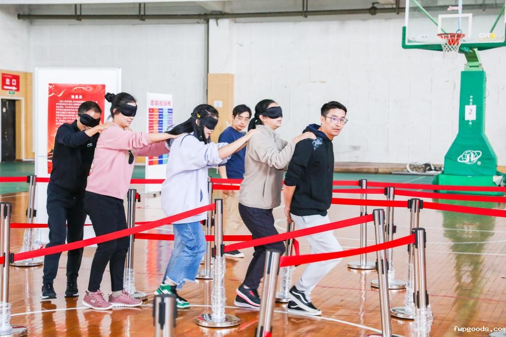 地道战(3女2男,由1人带领穿越地道,其余队员为蒙眼并双手搭在前一队员肩上前进)