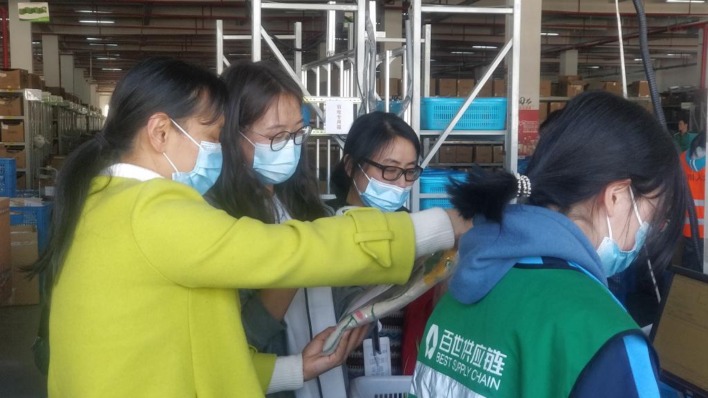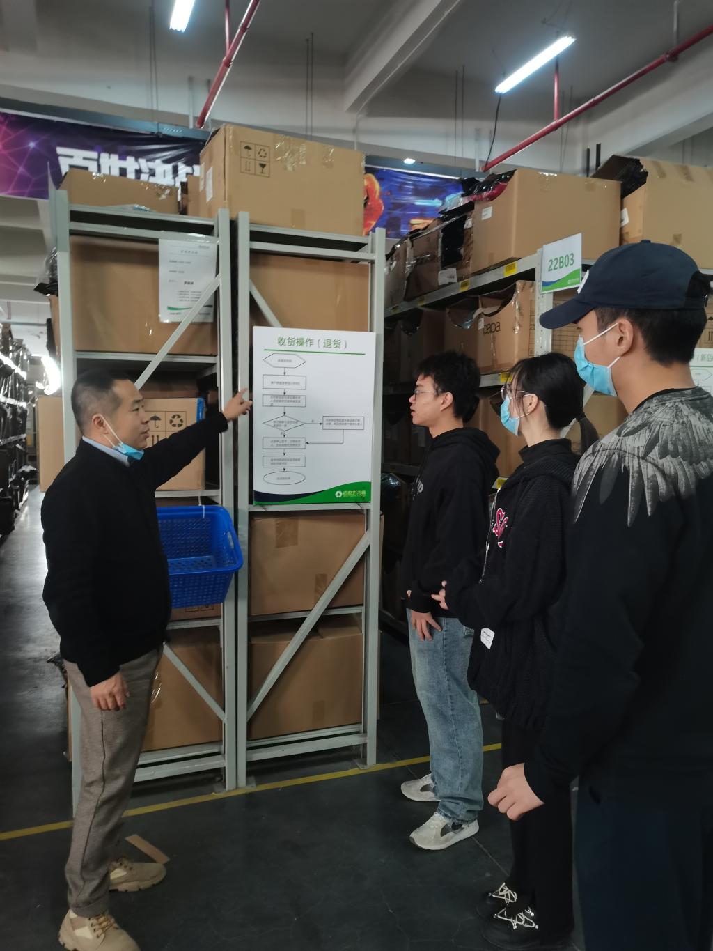 随后,王庆老师走到包裹作业区,看到同学们熟练进行接单、质检、分拣、打包、贴标签、退货等标准流程及业务操作,给同学们竖起大拇指。仓库分拣第一名何顺宝同学笑着说:如果老师同学们收到了今天下午百世物流仓出库的鞋子,可能就是经过我的手,鞋盒里有我的一份服务温度。王老师笑了笑说:“认真工作是态度,用心服务是温度,这是书本和课堂教学学不会的。鞋子从生产地环保、准确、快速地到达客户手上,能让客户体验网上购物的快乐,这是我们专业倡导的专业文化‘绿潮逐梦、使命必达’。”