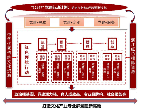 紧紧围绕立德树人根本任务,始终坚持以习近平新时代中国特色社会主义思想为指导,充分利用中华优秀传统文化和浙江红色根脉资源,持续深化“文道匠心”党建品牌,全面实施“12357”行动,建强红色党建堡垒、树立红色“文道”先锋、传承红色廉政文化、点亮红色心灵“灯塔”、用好红色活页教材、执飞红色匠心航班和建设红色爱馨驿站,打造“政治根基实、党建活力强、育人成效高、专业品牌响、社会服务亮”的样板支部。