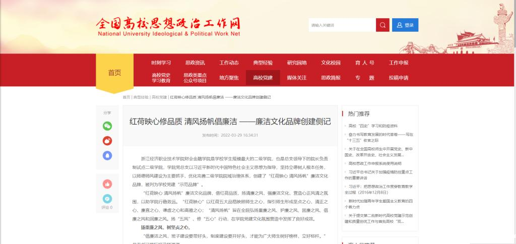 近日,全国高校思想政治工作网报道我校财会金融学院“红荷映心 清风扬帆”廉洁文化品牌,借红荷品质,扬清廉之风,强廉洁文化,营造心正风清之氛围,以助学院行稳致远。“红荷映心”以红荷五大品格映照师生之心,指引师生形成坚贞之心、清正之心、廉直之心、谦虚之心和高雅之心;“清风扬帆”旨在全院弘扬重廉之风、护廉之风、固廉之风、倡廉之风和润廉之风。扬“五风”、修“五心”行动,在学院党建文化氛围营造中发挥了良好成效。