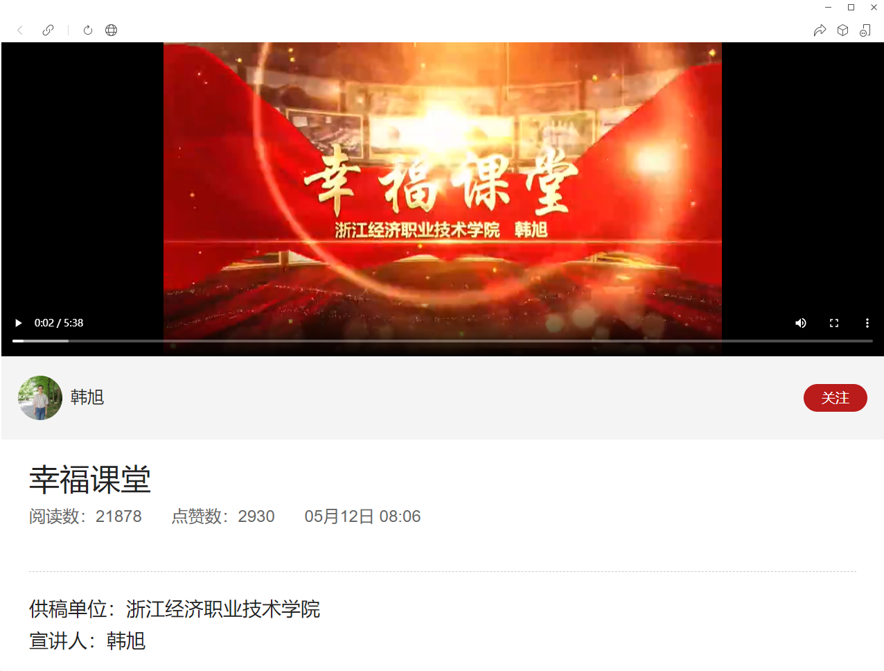 近日,《浙江新闻客户端》在“我在窗口写青春”共同富裕专题宣讲视频专栏里刊出我校《幸福课堂》宣讲作品,展示我校参与共同富裕的青春风采。