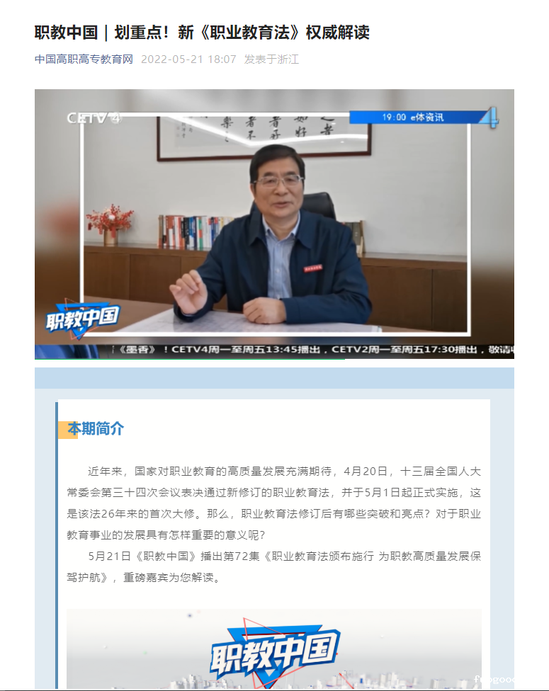 近日,中国教育电视台在《职教中国》节目中权威解读新《职业教育法》,我校校长邵庆祥参与了解读,发表了观点。