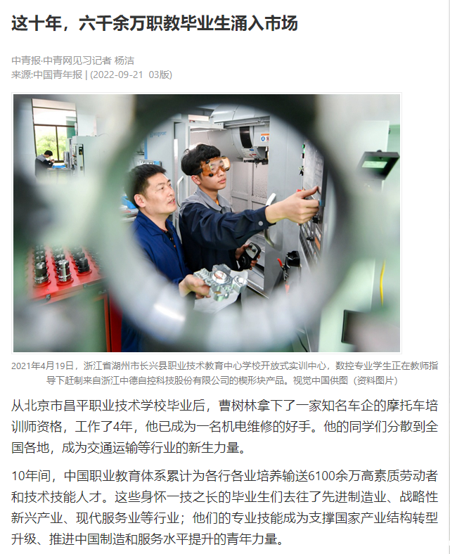 近日,《中国青年报》刊文介绍“这十年,六千余万职教毕业生涌入市场”,校长邵庆祥回顾我校产教融合发展研究脉络。教育部网站进行转载。