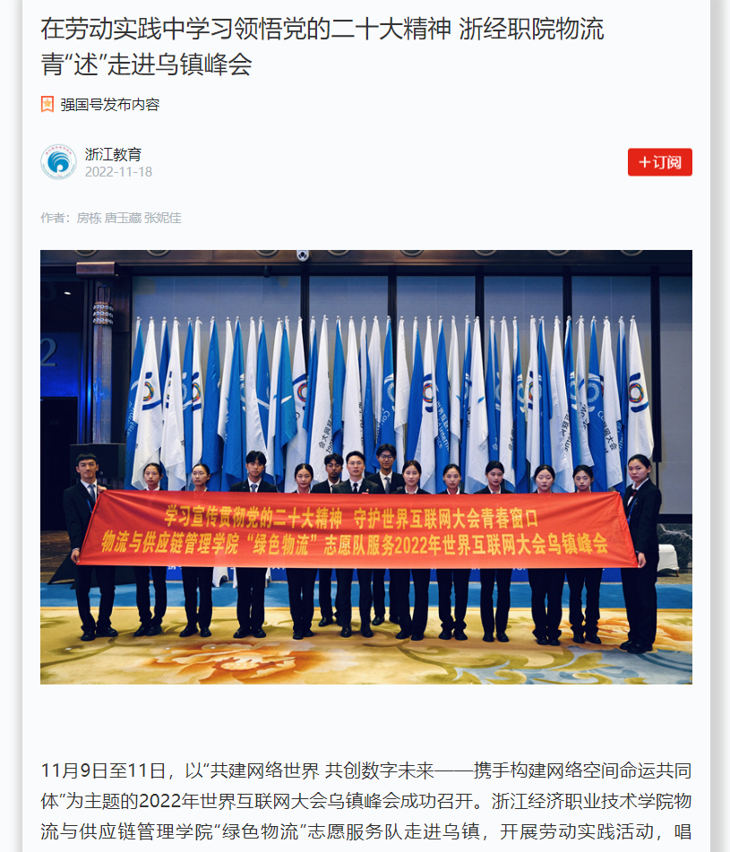 近日,《光明日报》报道了我校院物流与供应链管理学院“绿色物流”志愿服务队在2022年世界互联网大会期间走进乌镇,开展劳动实践活动,唱响“我在窗口写青春”的最强音,同时也开启了一堂别样的青“述”党的二十大精神的学习实践活动,激励学生投入到“两个先行”和中国式现代化进程中,贡献青年一代的力量。