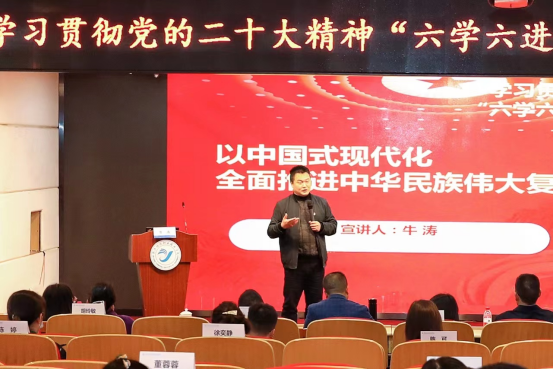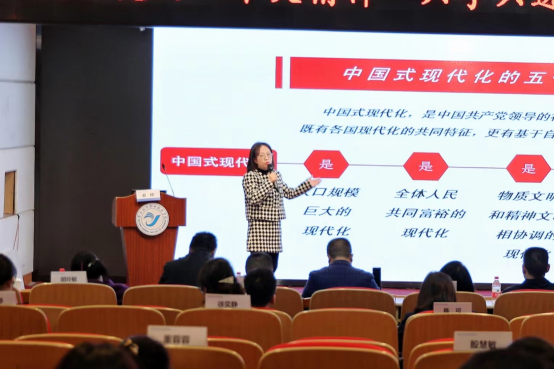 “金马先声”理论宣讲名师工作室负责人、浙江金融职业学院马克思主义学院副院长牛涛,作了《以中国式现代化全面推进中华民族伟大复兴》的专题报告;俞婷副院长作了题为《深刻领会中国式现代化道路的逻辑意蕴》的专题报告。两位老师从不同的视角,阐述了中国式现代化的重大意义和深刻内涵,让大家更加坚定“四个自信”。
